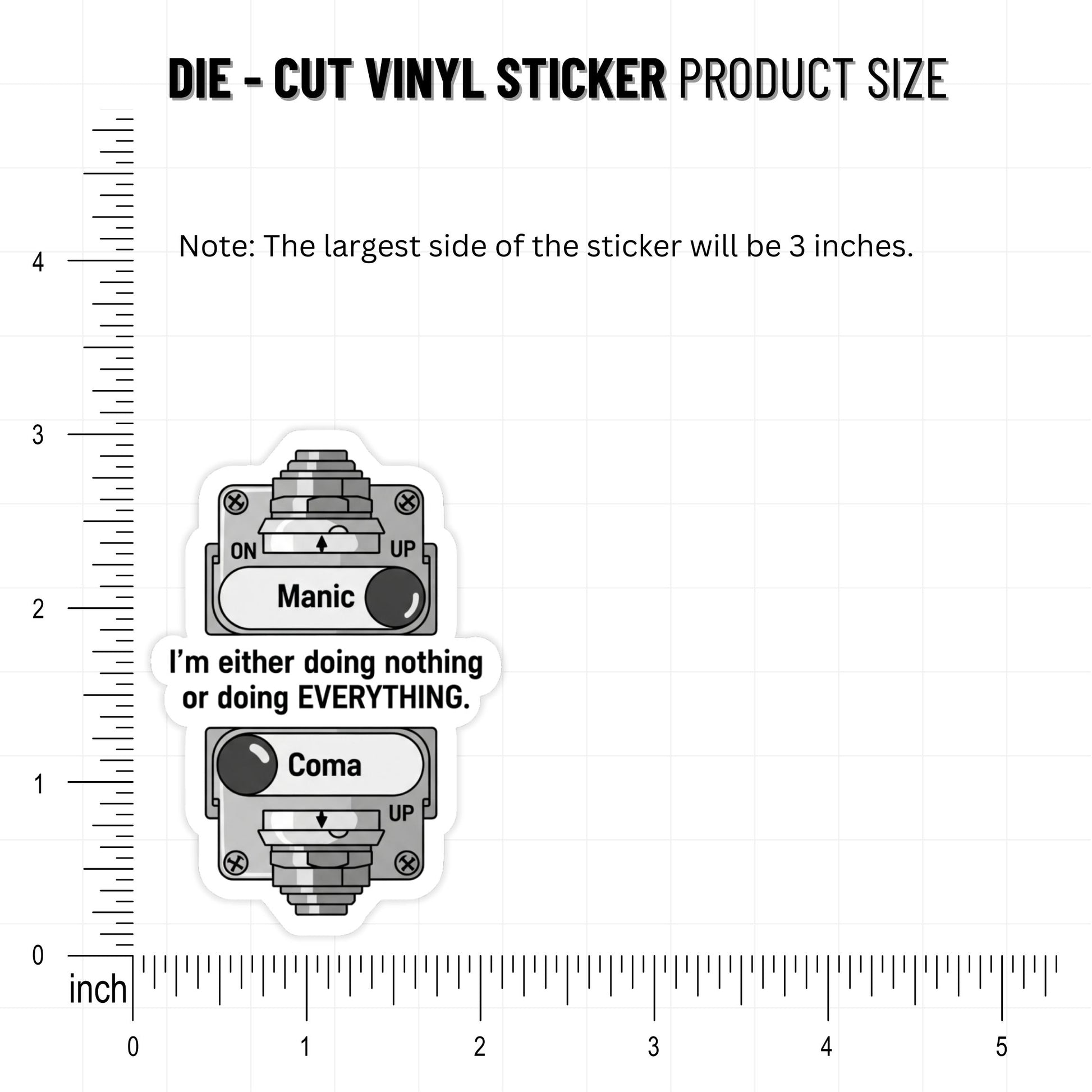 Using a clever tech metaphor, the design features a stark black-and-white light switch with only two extreme settings. It is a relatable visual for anyone who struggles with the middle ground of task management and productivity. This decal transforms invisible daily struggles into a funny, shared experience that builds community and reduces the shame of procrastination or hyperfocus.