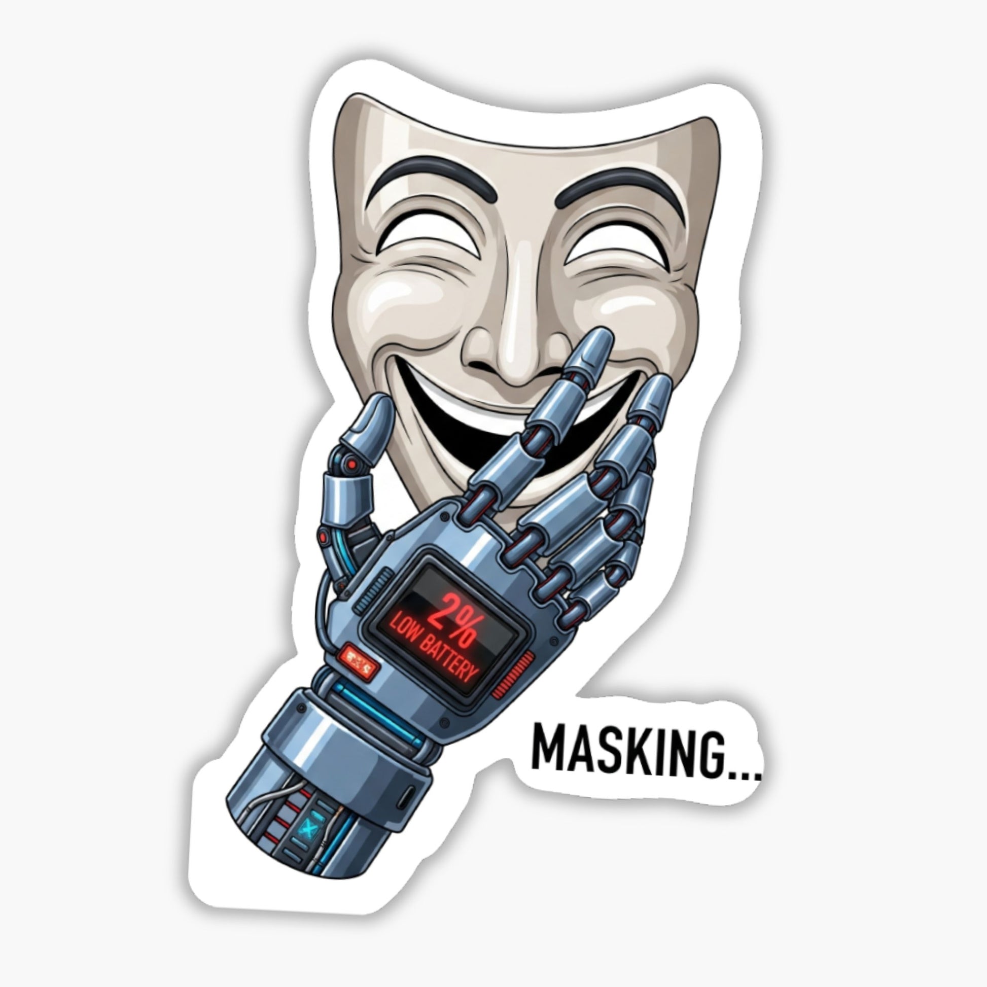 Is your social battery running on empty? This ADHD Masking Sticker features the relatable quote, Masking: ON. Battery: 2%, paired with a striking cyberpunk visual of a robot hand holding a theater mask. It perfectly captures that feeling when you are putting on a brave face for the world while your internal energy is flashing red. This ADHD Masking Sticker turns the invisible labor of social navigation into a cool, sci-fi aesthetic that lets you express your neurodivergent experience without saying a word. Use it as a soft reminder to recharge your circuits and embrace your true self.