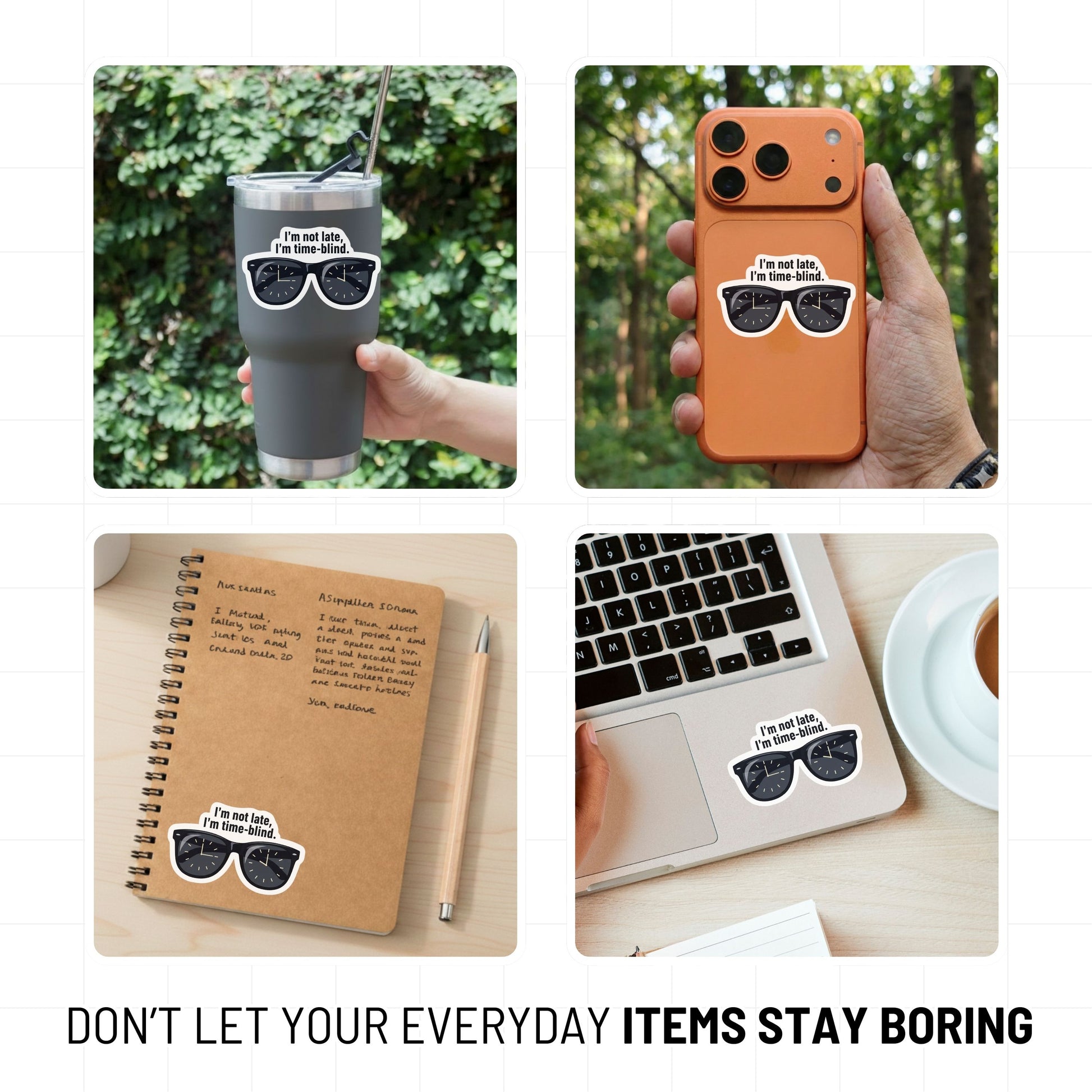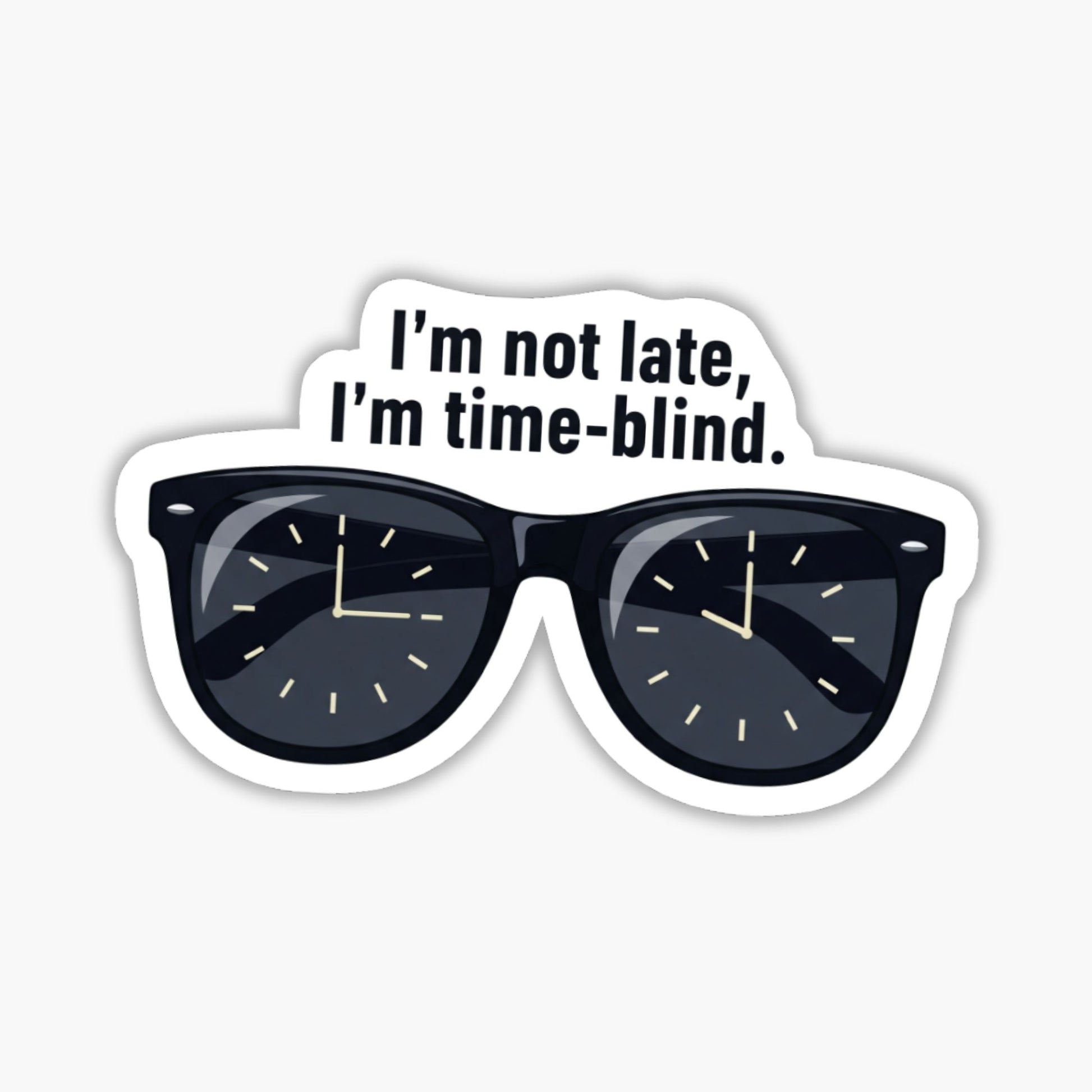 Embrace your brain's unique rhythm with our "I’m not late, I’m time-blind" sticker. Featuring a pair of cool retro sunglasses reflecting numberless clock faces, this design perfectly captures the reality of executive dysfunction with a touch of neurospicy confidence.