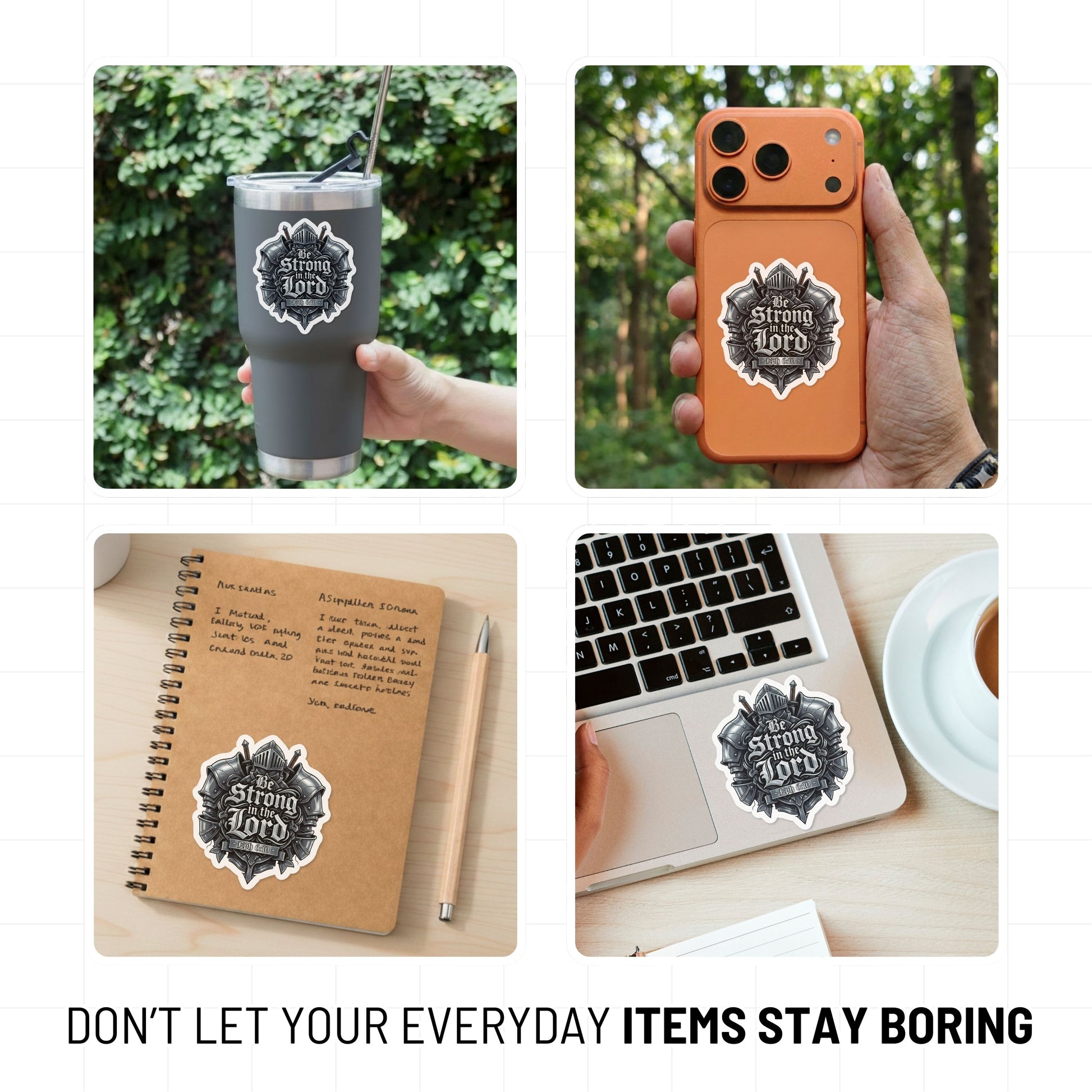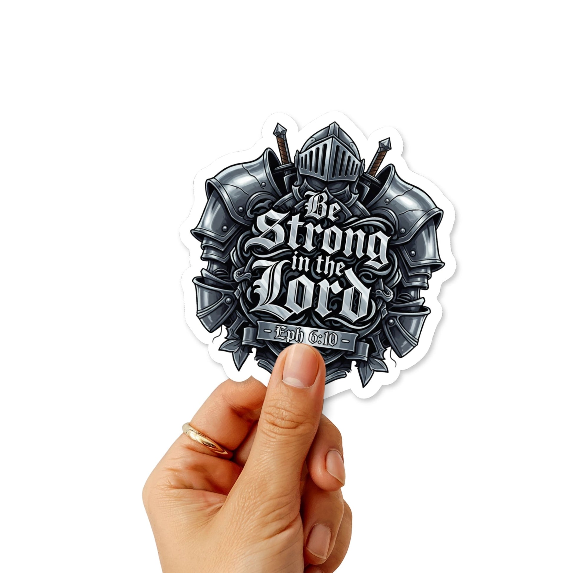 Be strong in the Lord and in the strength of His might with this powerful Ephesians 6:10 sticker. Featuring a bold Gothic typography style integrated with metallic armor motifs, this design serves as a visual reminder of the spiritual resilience found in Scripture.