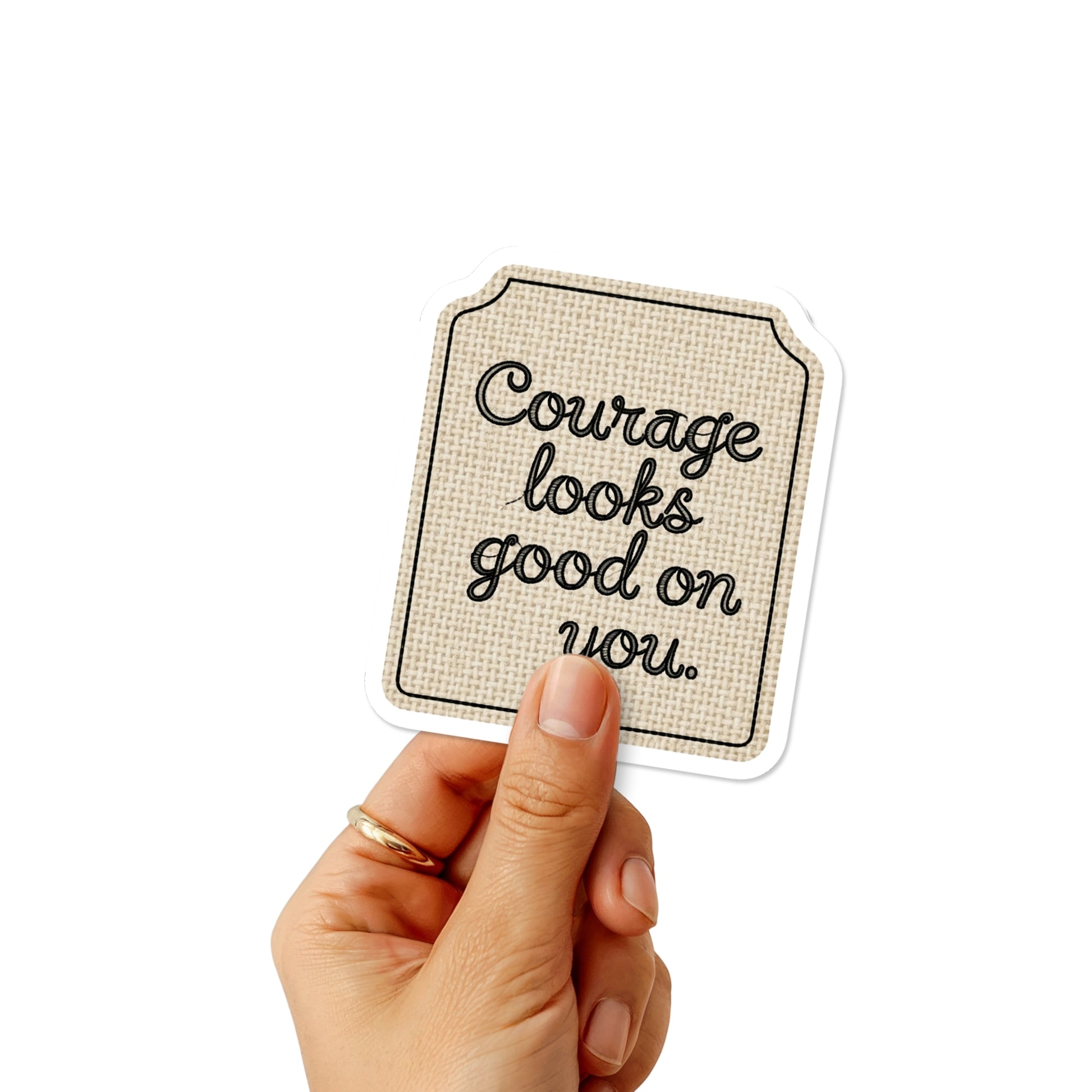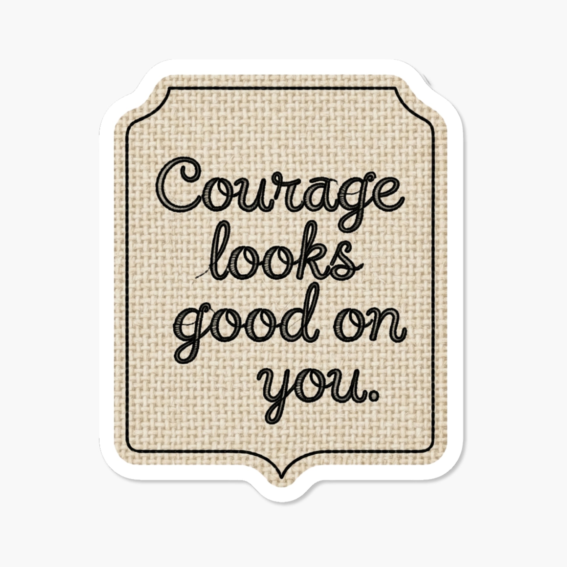 Wear your bravery like a badge of honor with our "Courage looks good on you" quote. This inspirational affirmation sticker is more than just a decoration; it is a portable mental pick-me-up for those facing life's hurdles. Designed as a rustic burlap clothing tag with intricate black embroidery effects, this sticker blends apparel-inspired fashion with timeless encouragement. The realistic fabric appearance makes it feel like a physical label you have earned, helping you curate a personal environment of optimism and inner strength.