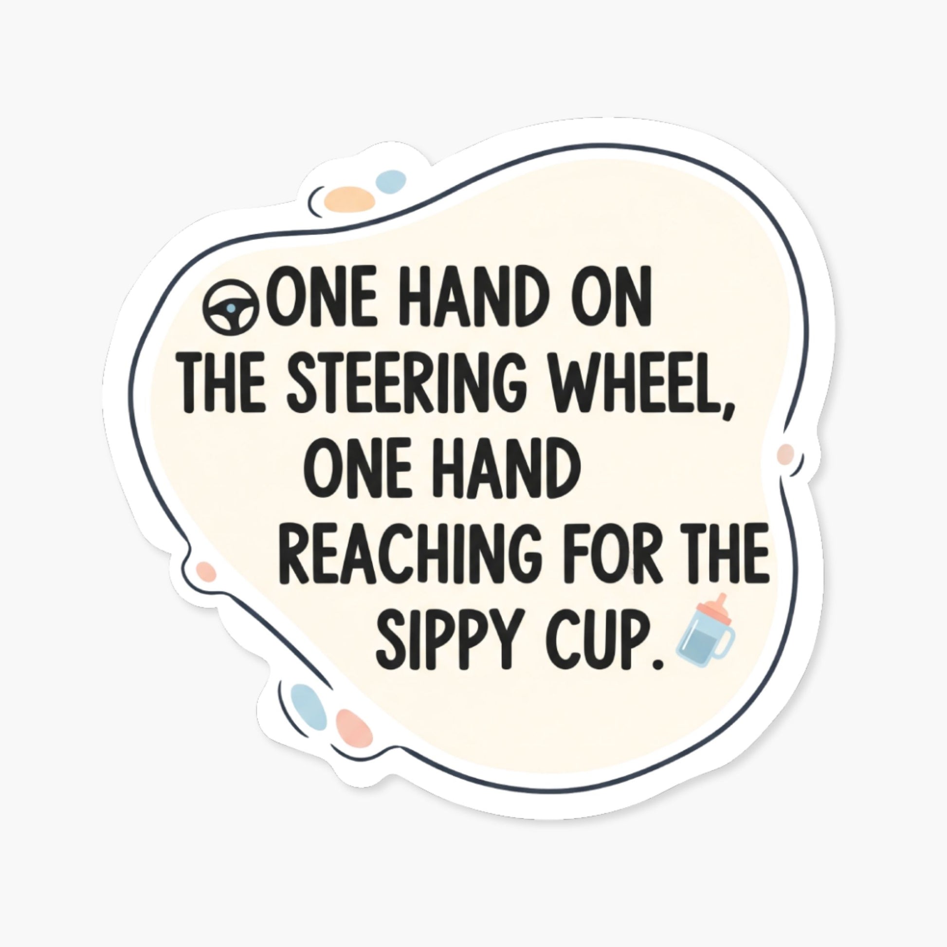 One hand on the steering wheel, one hand reaching for the sippy cup. This funny mom sticker is the ultimate badge of honor for every parent navigating the daily commute chaos. Whether you are hitting the preschool drop-off line or running weekend errands, this design captures the relatable multi-tasking reality of motherhood with a touch of humor and style.