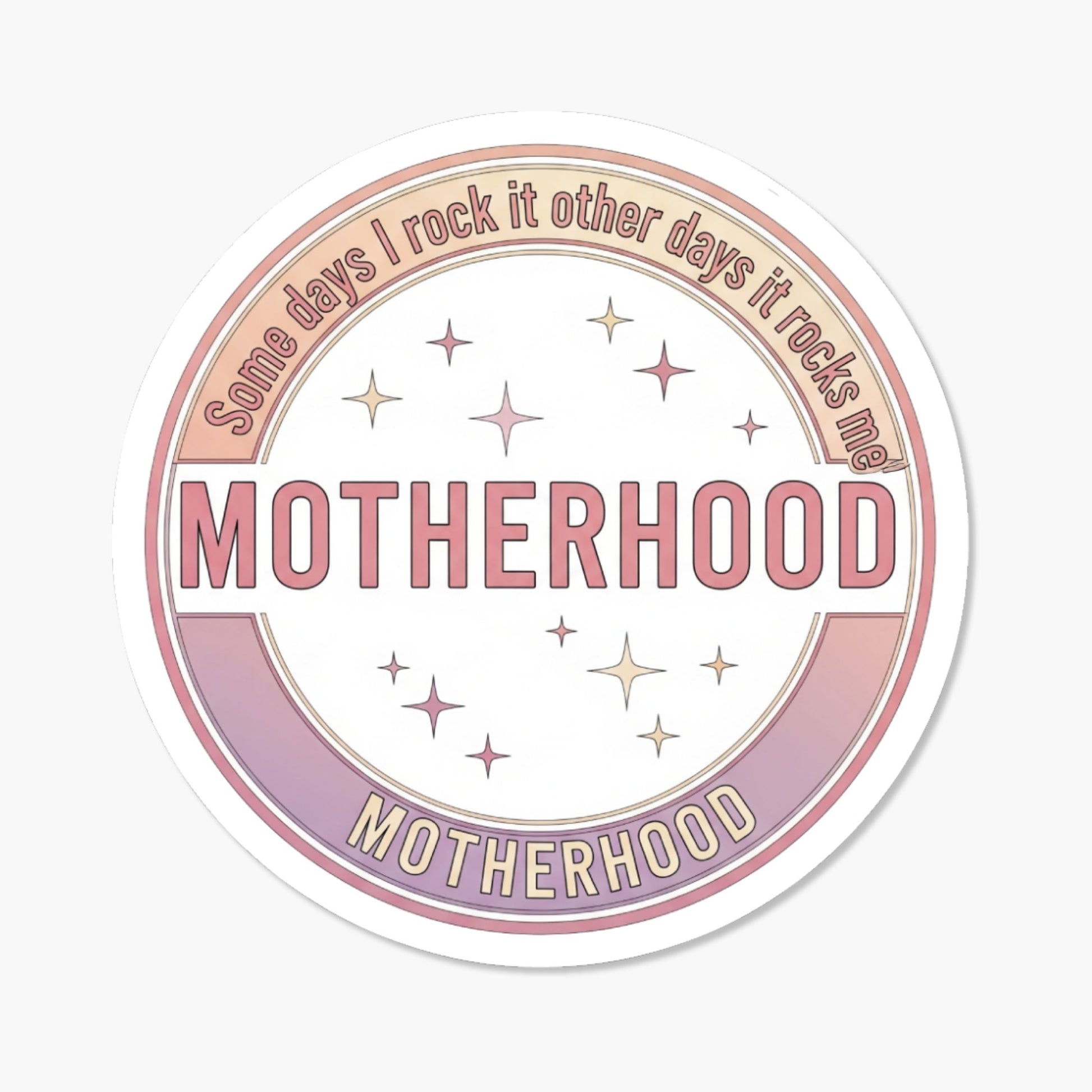 “Some days I rock it other days it rocks me” is the ultimate anthem for the modern mama navigating the beautiful chaos of raising tiny humans. This funny motherhood sticker captures the relatable rollercoaster of parenting, blending a sleek circular seal design with a soft, trendy aesthetic of peach, lilac, and cream gradients accented by twinkling stars. Whether you are expertly managing a school drop-off or simply surviving on cold coffee and dry shampoo, this high-quality decal honors the hilarious reality of the 24/7 mom life. It is more than just a decoration; it is a badge of belonging for the motherhood community, designed to make you smile every time you reach for your drink. This circular seal motif offers a sophisticated yet playful look that fits seamlessly into any mom’s daily routine.