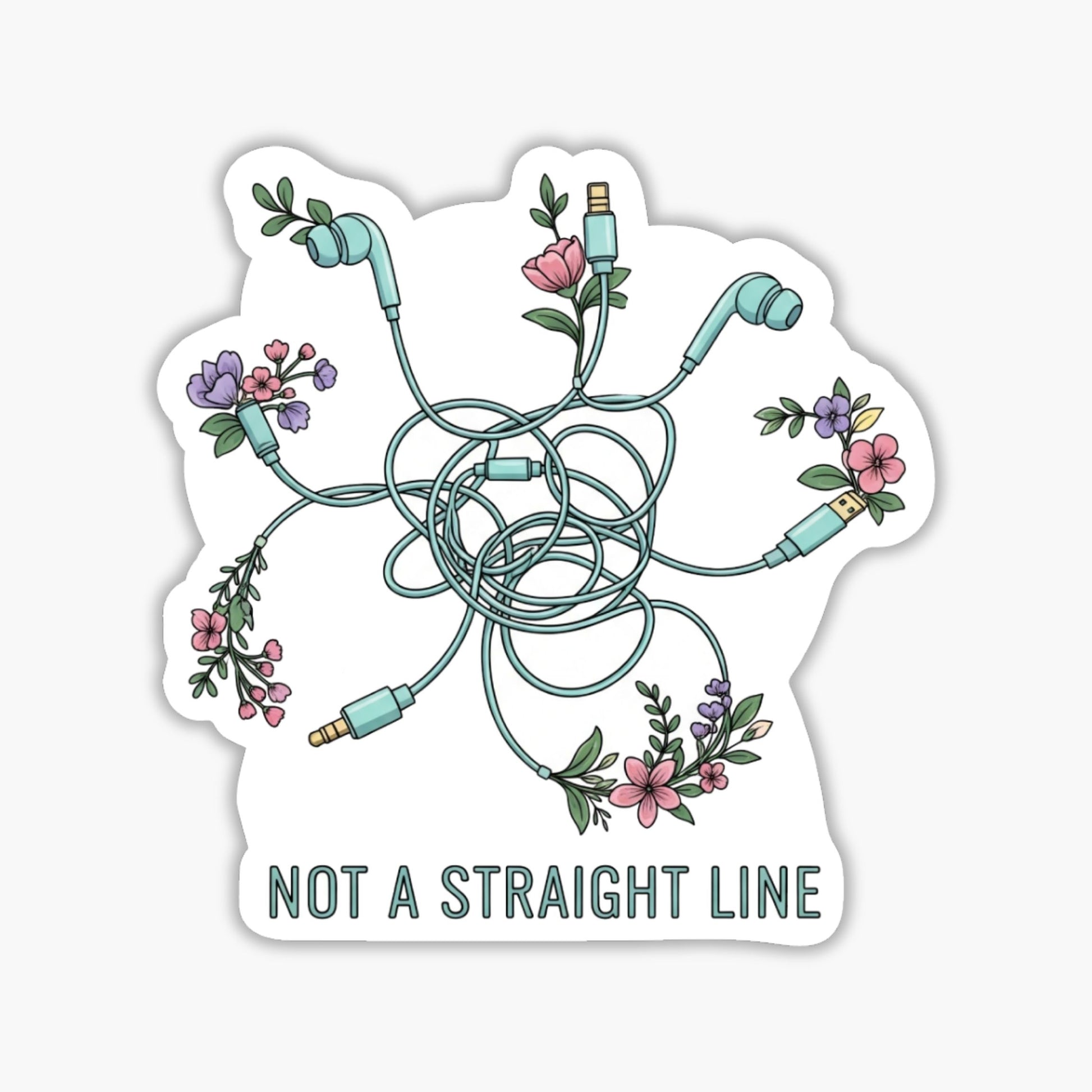 Embrace the journey with our Healing isnt linear sticker, a gentle reminder that progress often looks like a beautiful mess before it finally blooms. This aesthetic decal features a clever tech metaphor where tangled headphone wires—representing those mental knots we all navigate—gradually sprout delicate pastel wildflowers at the ends. It is a visual celebration of the fact that growth is rarely a straight path.