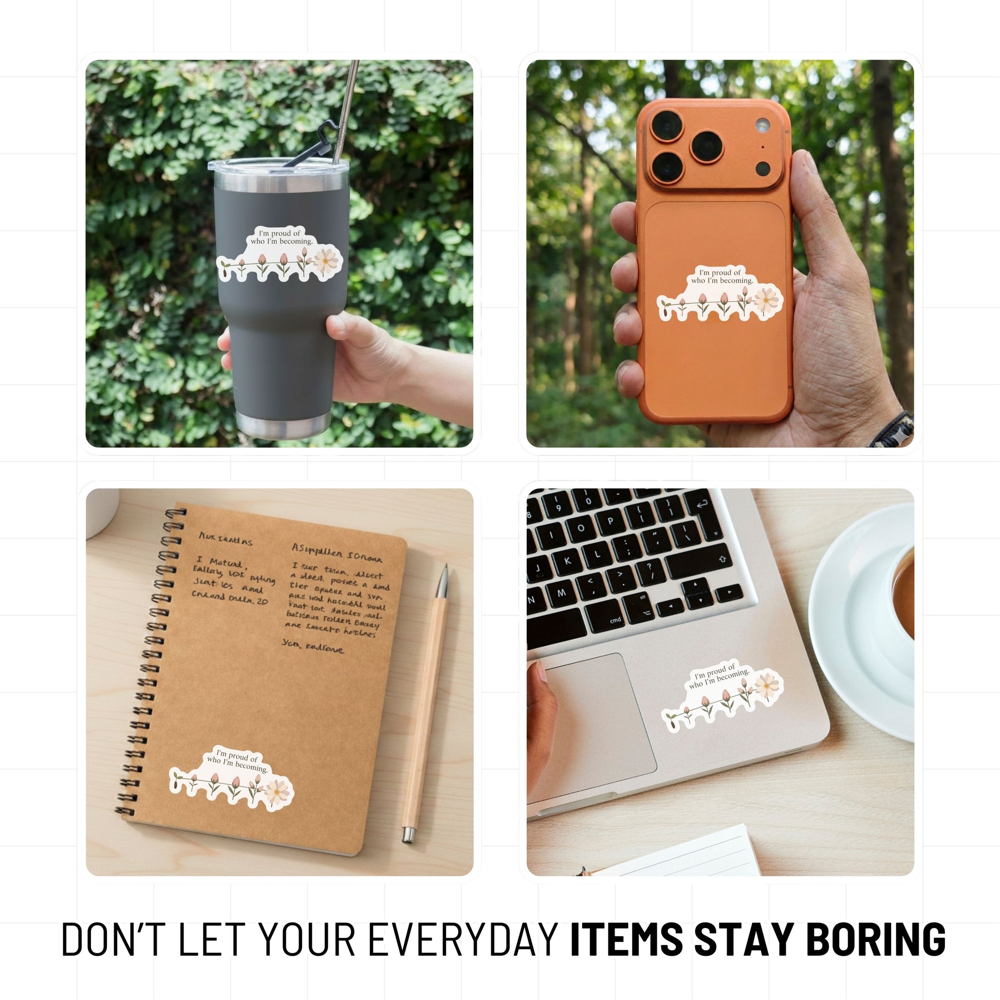 "I’m proud of who I’m becoming" is more than just a quote; it’s a celebration of your personal evolution and continuous progress. This self-growth sticker features a beautiful flower blooming timeline, visually illustrating that growth isn't a sudden event but a rewarding journey of self-worth and quiet confidence. It serves as a gentle daily reminder to honor every stage of your healing and personal development, even the quiet moments of rest. Whether you are recovering from burnout or simply embracing your authentic self, this decal helps you stay anchored in your values and self-respect. Perfect for: