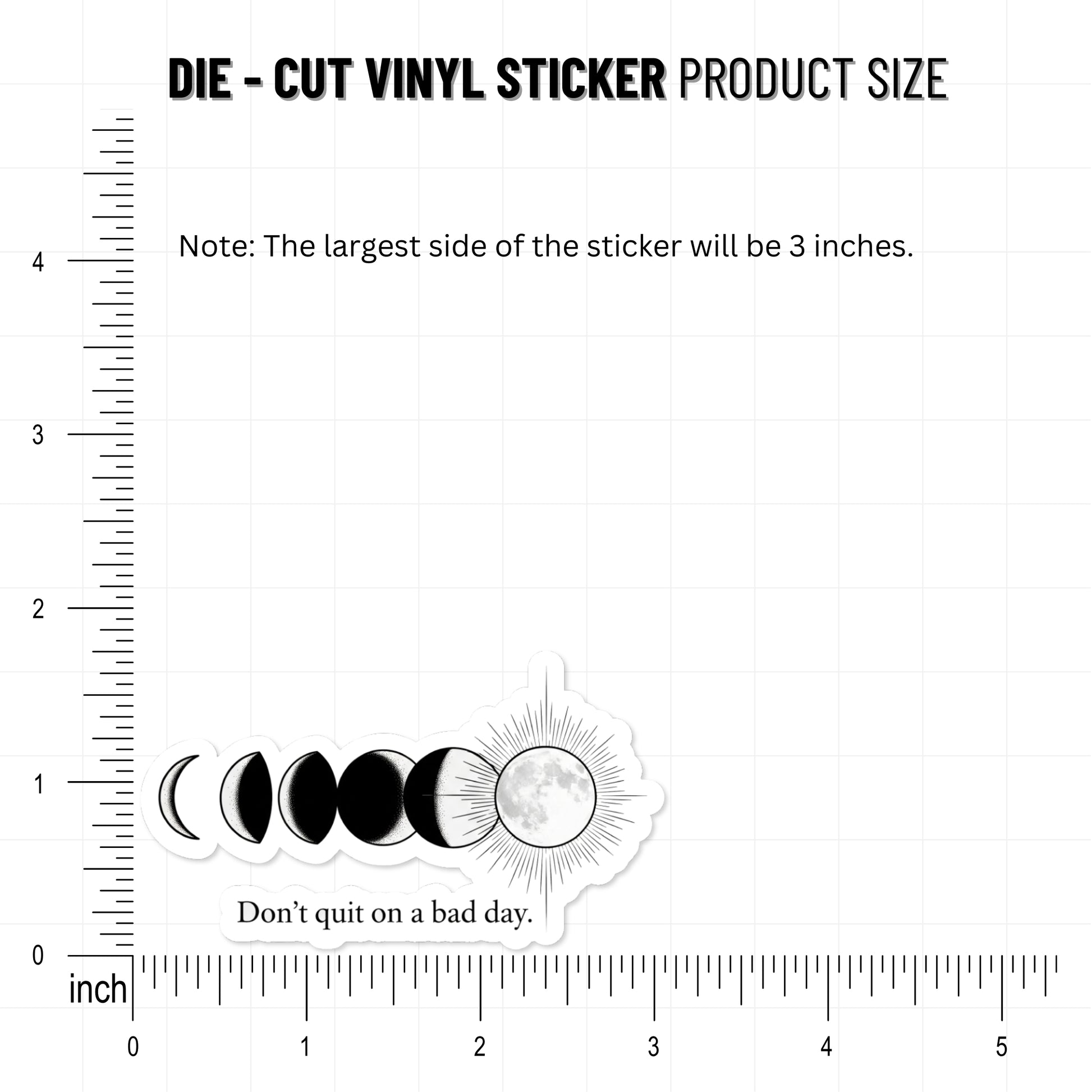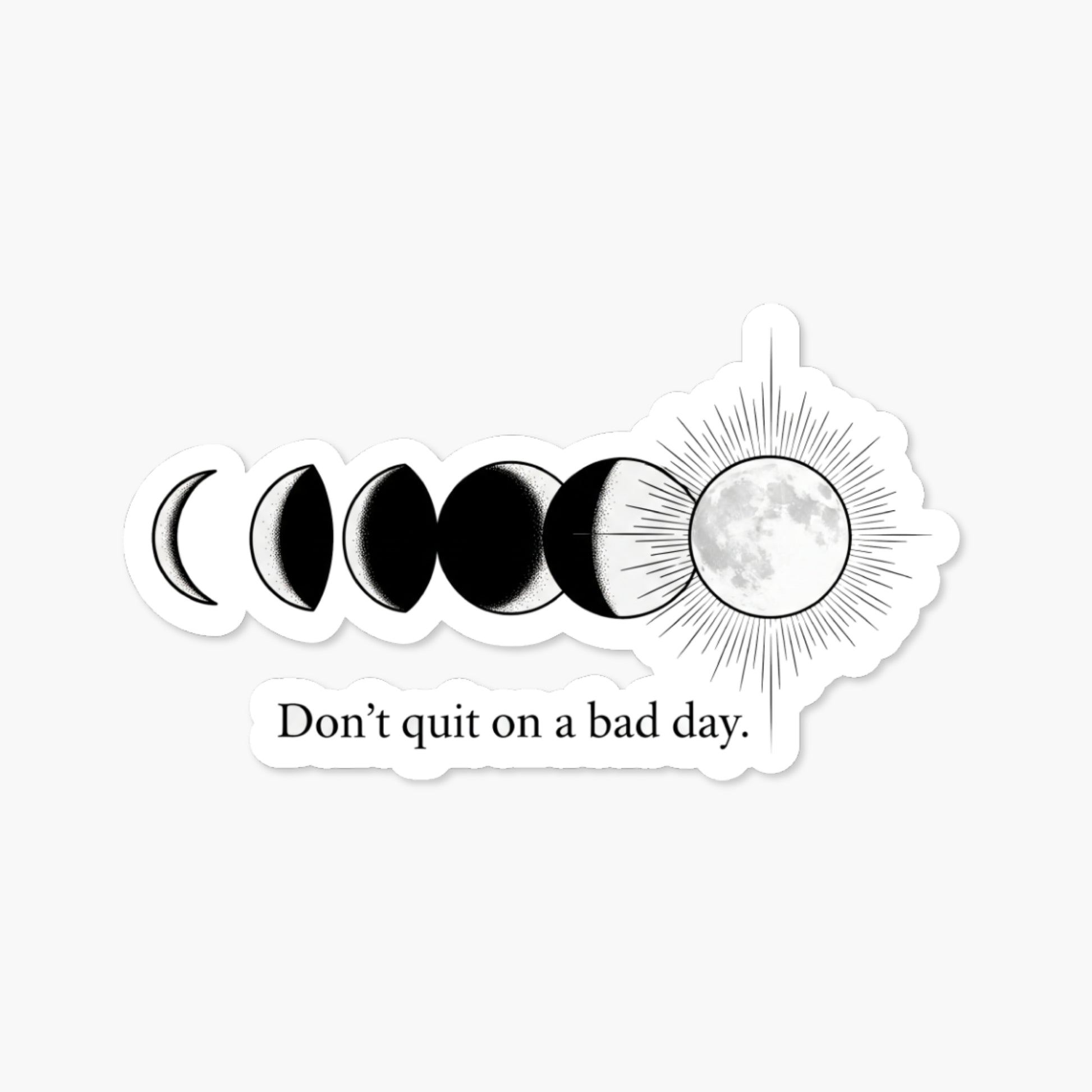 Sometimes life feels like a waning moon, but this Inspirational Moon Sticker reminds you that light always returns. Featuring the powerful quote, "Don’t quit on a bad day," this design illustrates the beauty of persistence through a detailed monochrome lunar cycle. Just as the moon transitions from a sliver of shadow to full brightness, this visual metaphor reminds us that every struggle is simply a temporary phase. The sophisticated black, white, and silver palette creates a calming, astronomical aesthetic that serves as a portable mental pick-me-up during stressful moments.