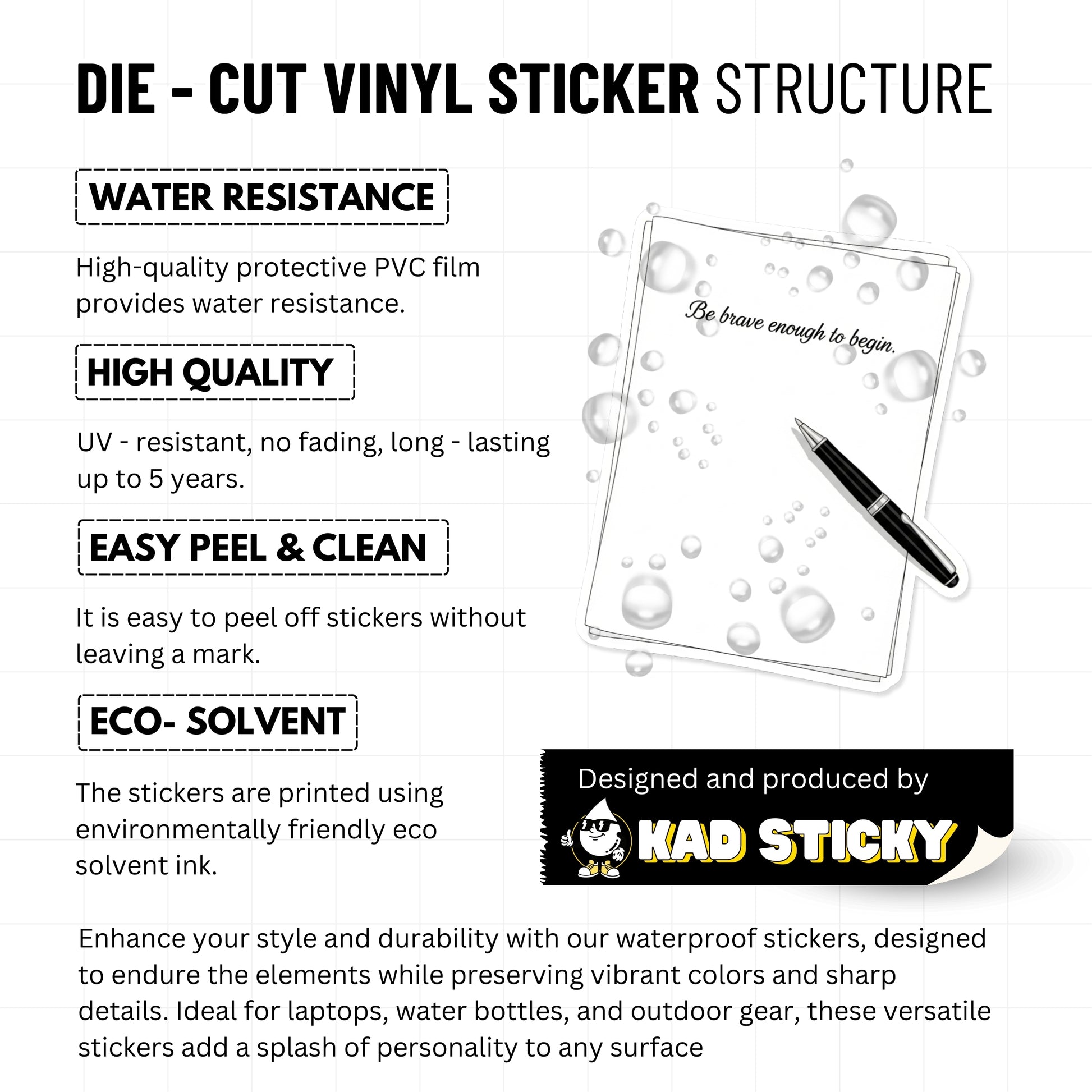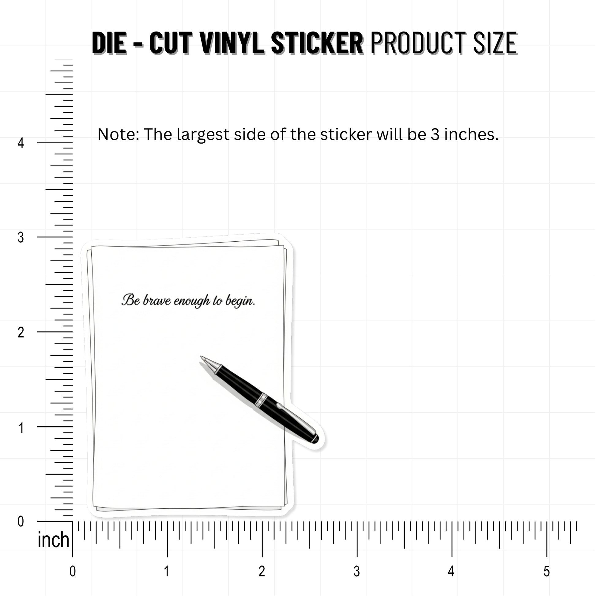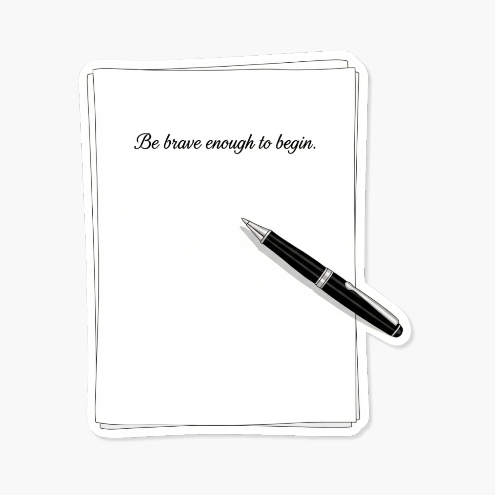 Embark on your next chapter with this inspirational quote sticker featuring the powerful message: Be brave enough to begin. This sticker serves as a gentle reminder that every masterpiece starts with a single courageous word. Inspired by the crisp potential of a fresh page and a resting pen, the visual design captures the quiet courage required to start something new. Whether you are staring at a blank screen or embarking on a significant life transition, this minimalist aesthetic mirrors a writer's focused environment to help quiet self-doubt and focus on that crucial first step.