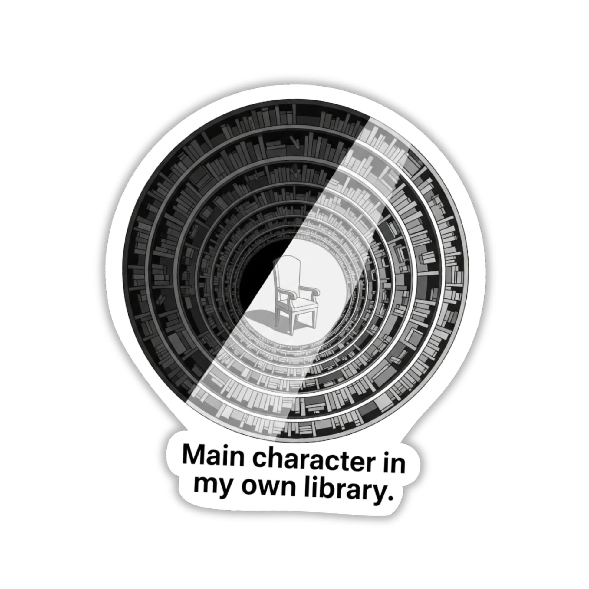 Claim your narrative with our "Main character in my own library" Book Lover Sticker. Featuring an intricate, M.C. Escher-inspired infinite spiral library design in a sophisticated monochromatic palette, this sticker captures the philosophical depth of a life lived through literature.