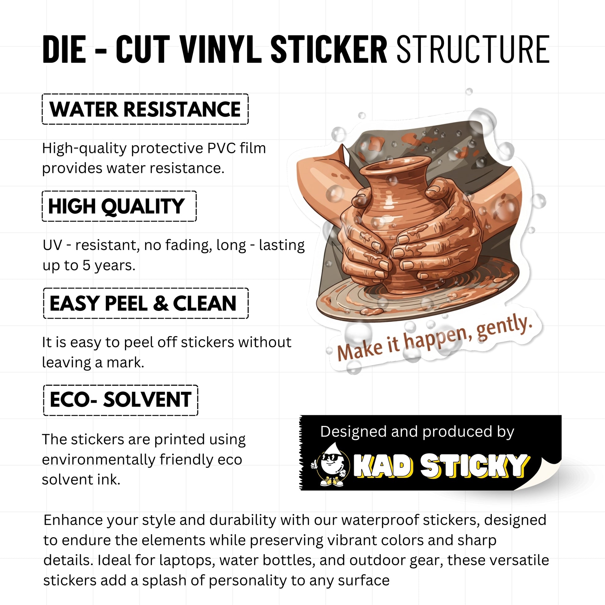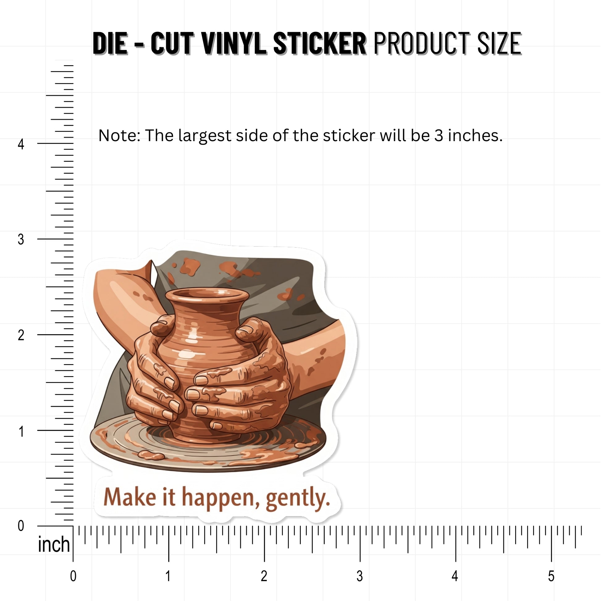 Bring a touch of grace to your goals with our "Make it happen, gently" inspirational affirmation sticker. This design features a beautiful pottery-inspired illustration of hands gently shaping raw clay into a vessel. It serves as a visual metaphor for personal growth, reminding you that progress does not always have to be forced; sometimes the most beautiful results come from a soft, steady touch. The earthy terracotta tones and messy hands aesthetic create a soothing, grounded look for your daily environment.
