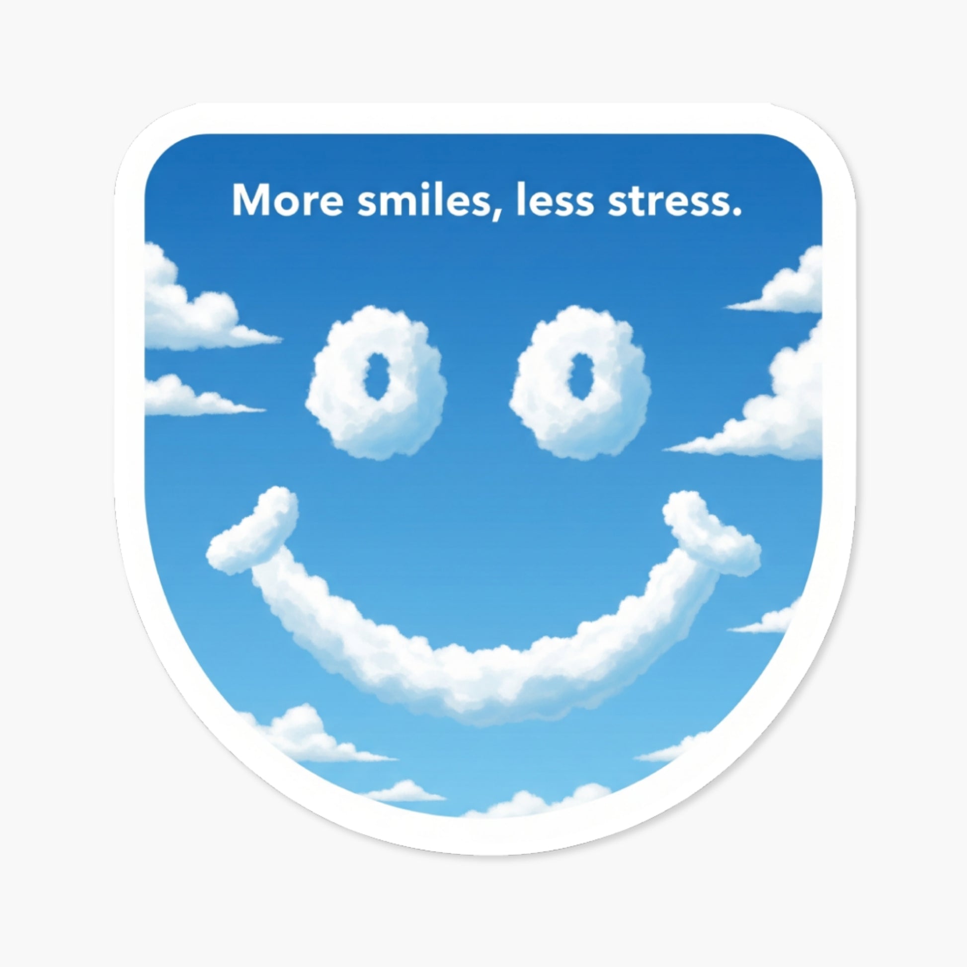 "More smiles, less stress." — a simple daily reminder to breathe and find joy in the little things. This uplifting positivity sticker captures the essence of a serene summer day, featuring fluffy white clouds arranged into a cheerful smiley face against a clear blue sky. It is designed to act as a portable emotional booster, helping you reset your mood whenever life feels overwhelming. Whether you are navigating a busy workday or a tough study session, this sky-inspired metaphor serves as a gentle visual prompt to prioritize your peace of mind.