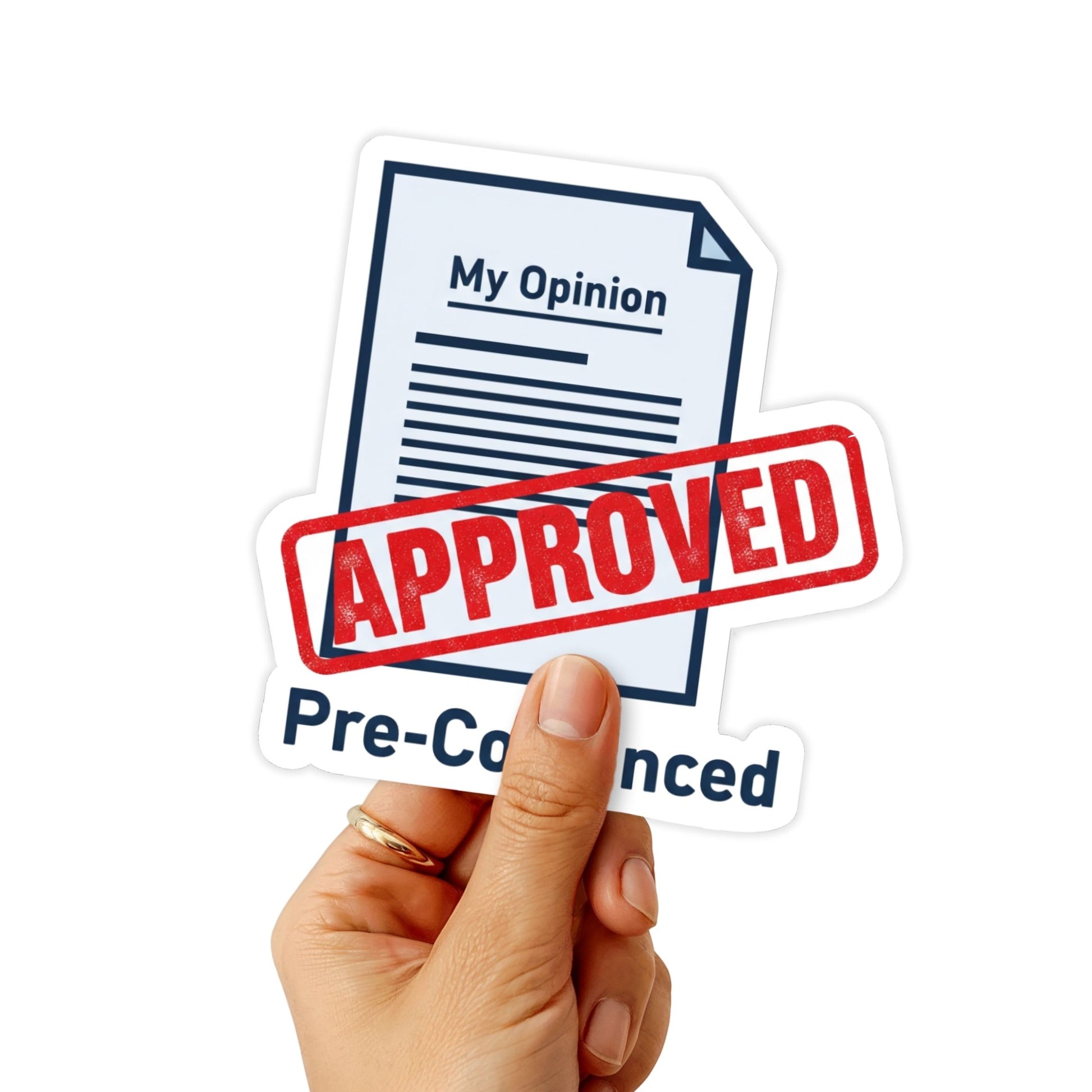 "I’m not stubborn, I’m pre-convinced." This bold statement is the ultimate badge of honor for the person who doesn’t just have an opinion—they have the correct opinion. Whether you are navigating a corporate meeting or a casual debate with friends, this sarcastic office sticker serves as your official warning label. The design leans into a professional Bold Office aesthetic, featuring a striking navy, red, and white color palette. A visual pun at its finest, it depicts a thick APPROVED stamp slammed onto a My Opinion document, effectively shutting down any counter-arguments before they even begin. It is more than just a piece of vinyl; it is a witty shield against unwanted advice and a way to turn stubbornness into a hilarious personality trait. Designed to withstand the daily grind, this decal is built for those who lead with wit and confidence.
