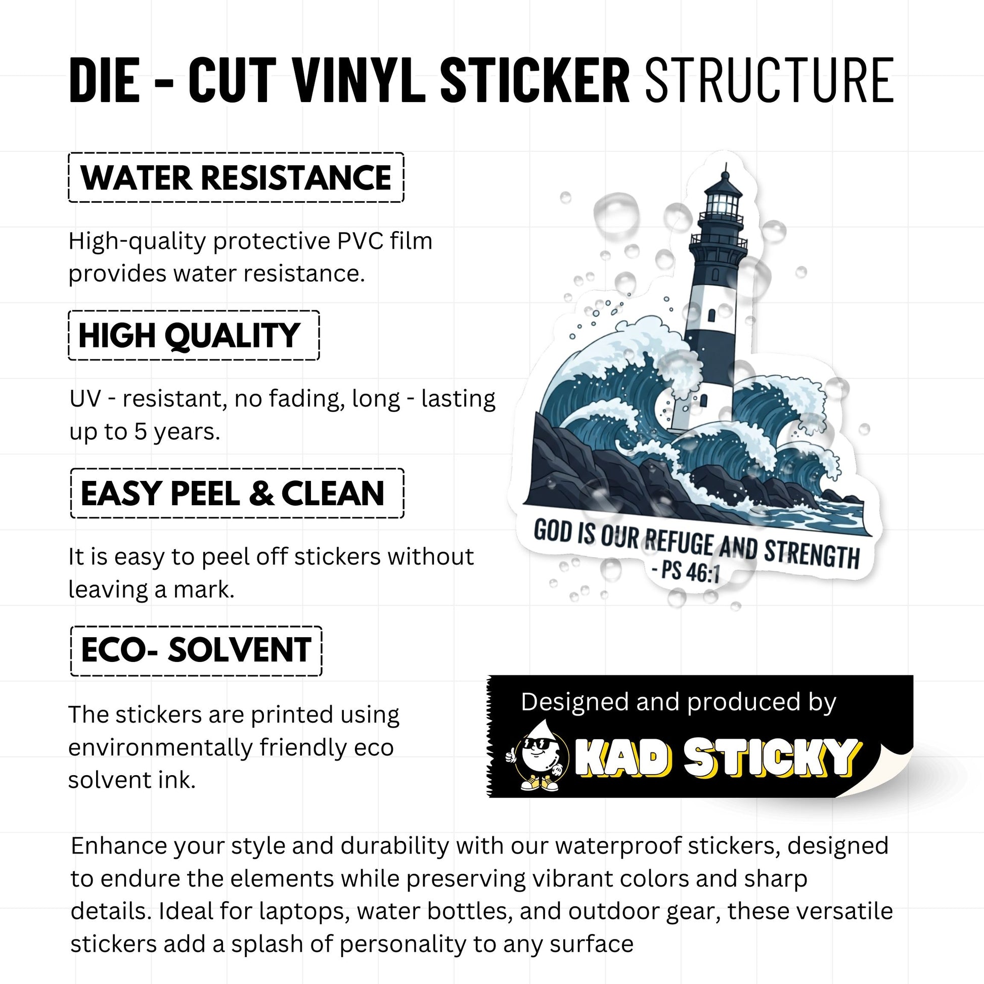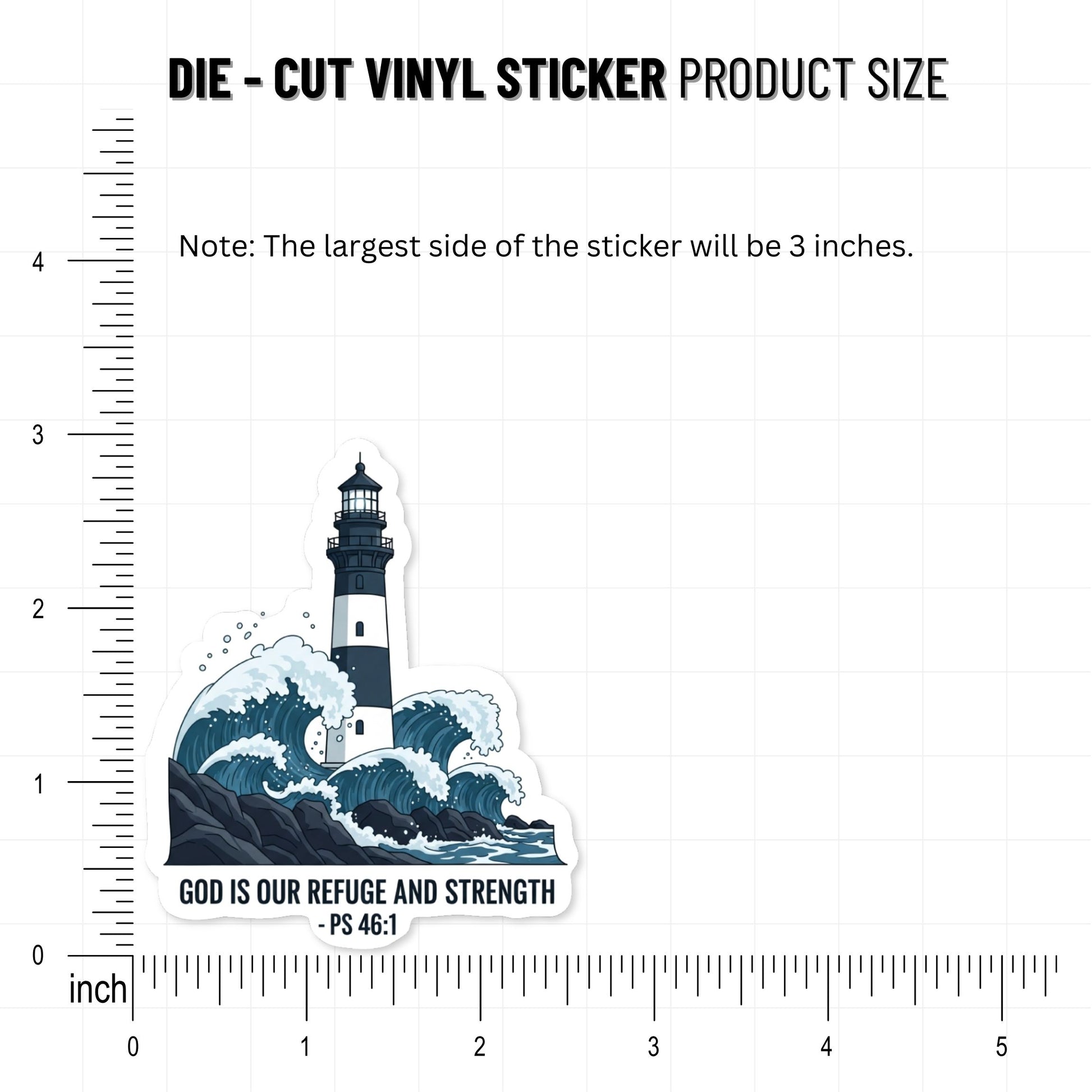 "God is our refuge and strength - Ps 46:1" This powerful anchor from the Psalms serves as a steadfast reminder that no matter how high the waves crash, your foundation remains unshakable. This Christian Bible Verse Sticker features a majestic lighthouse standing firm against dramatic lead-gray waves and deep blue waters. It captures the essence of divine protection during life's most turbulent seasons, transforming a simple accessory into a portable devotion that speaks to the soul when things get overwhelming. This modern faith aesthetic is perfect for those who want a visual testimony of resilience in any environment.