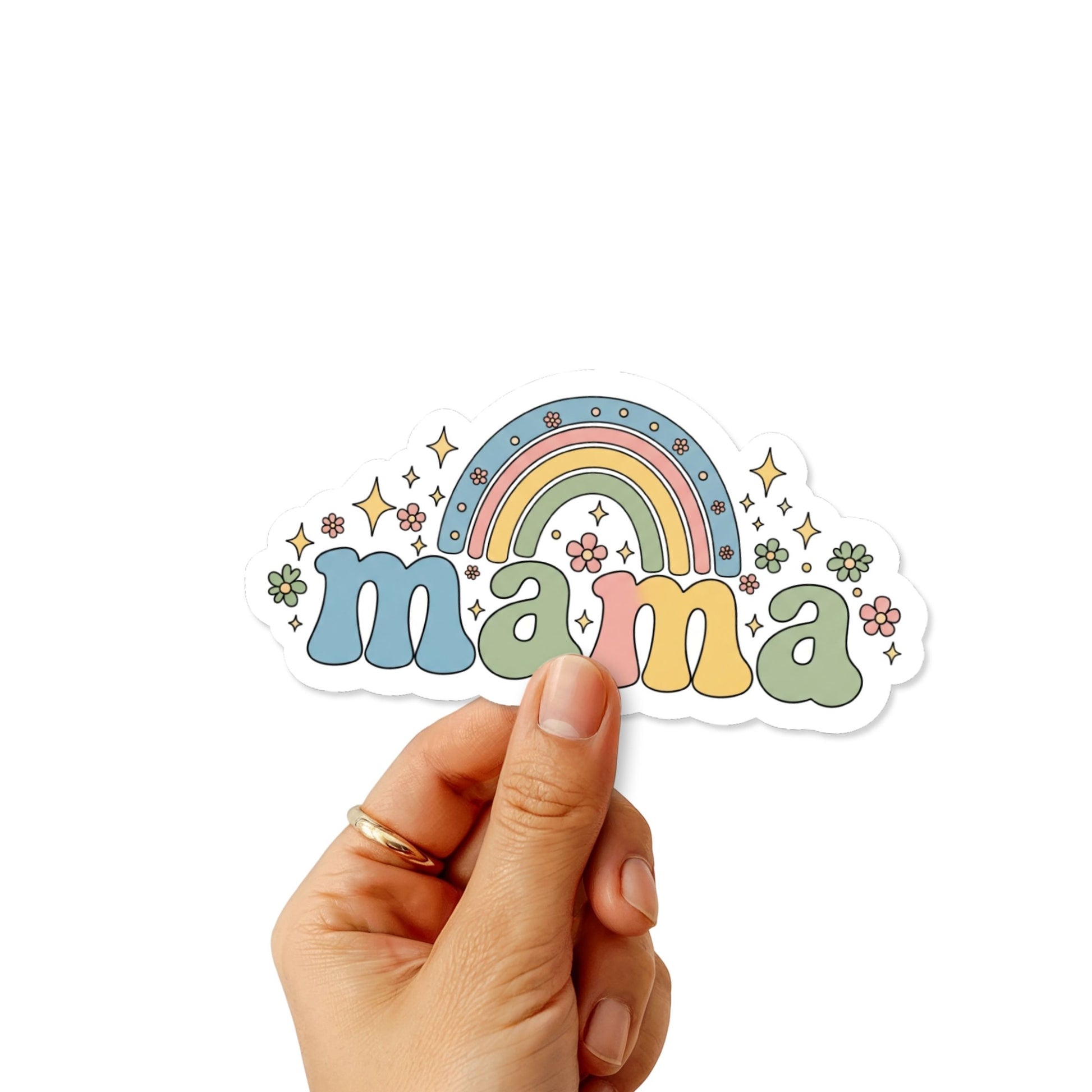Celebrate motherhood with our signature "mama" retro rainbow sticker, designed to add a splash of joy to your morning routine. Featuring a nostalgic rounded font paired with a delicate pastel rainbow and tiny floral accents, this decal perfectly captures the upbeat energy of a busy mom. The soft baby blue and sage green palette offers a calming, trendy aesthetic that stands out on any surface. Whether you are heading to school drop-offs or enjoying a quiet moment with your coffee, this sticker is a sweet reminder of your most important role. It is a fantastic way to personalize your gear or bundle as a gift for a new mom.