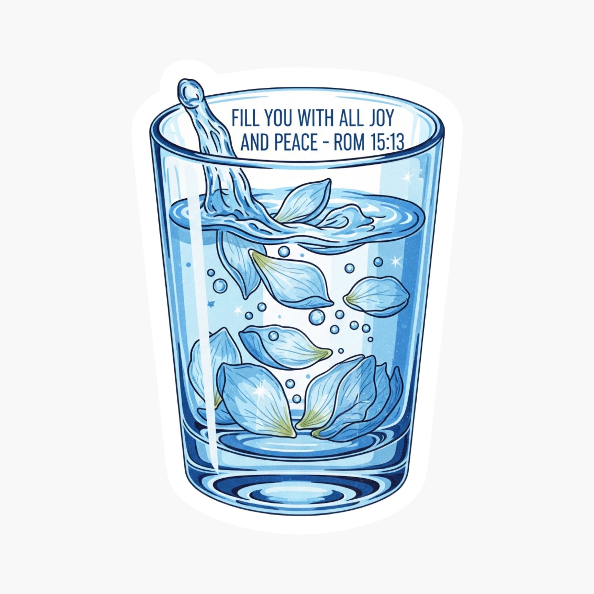The visual concept uses a beautiful metaphor of a glass cup overflowing with sparkling blue water and delicate floating petals. This imagery captures the essence of a heart saturated by the Holy Spirit, reminding you that God's grace is never-ending. Whether you are navigating a stressful season or celebrating a personal win, this cool aesthetic sticker keeps you grounded in His promise of tranquility and refreshment.