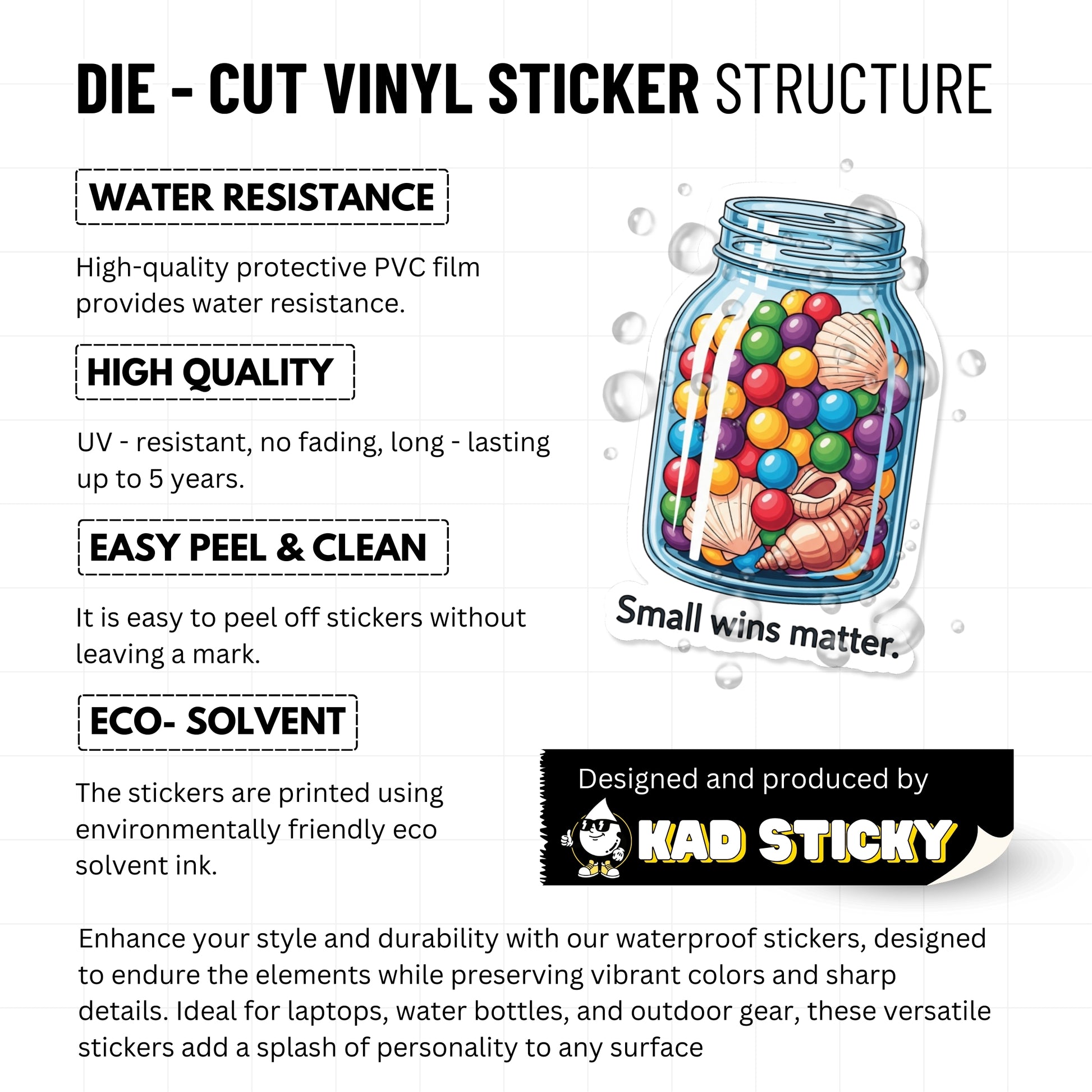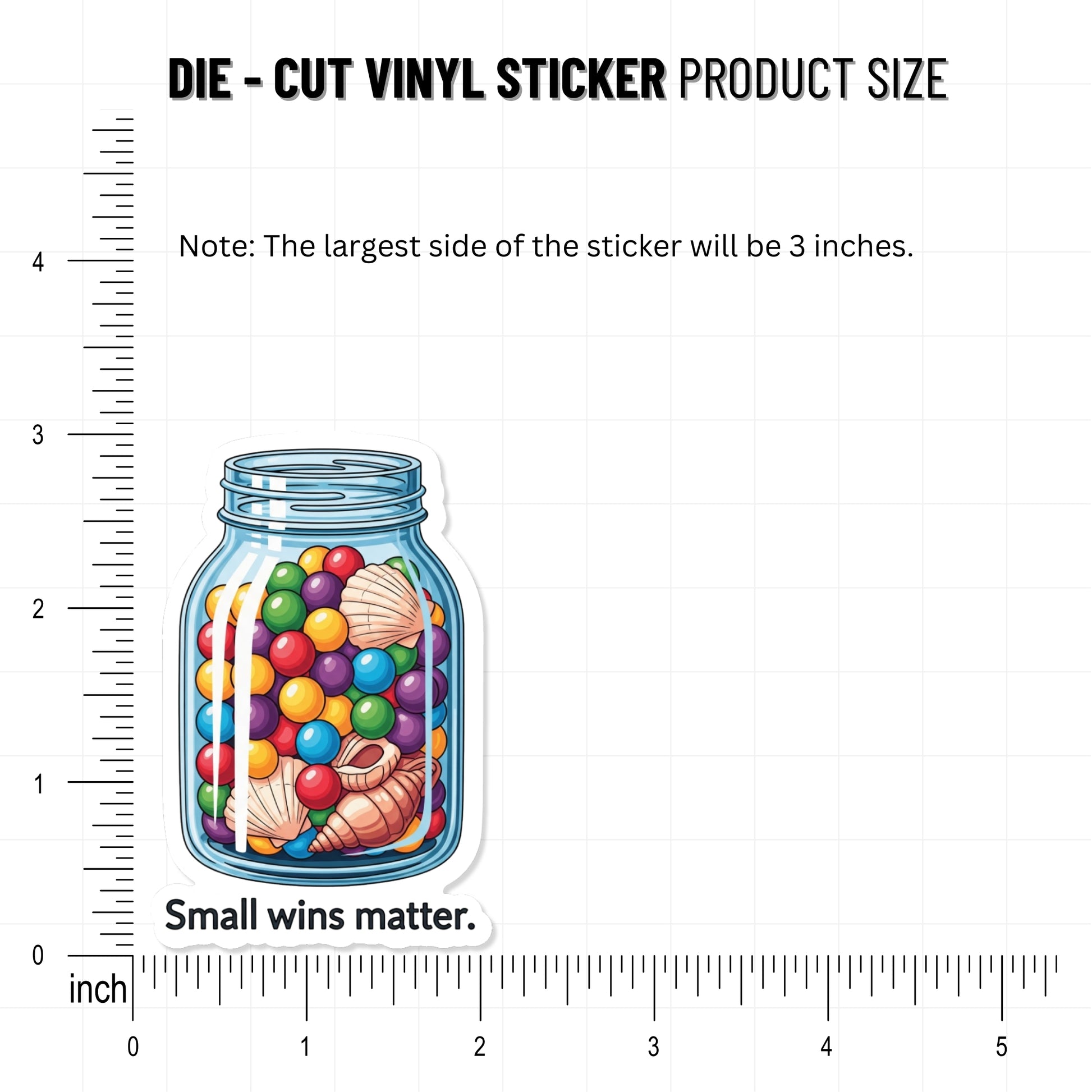"Small wins matter." This positive affirmation sticker serves as a gentle visual cue to celebrate every little victory in your journey. The design features a nostalgic memory jar filled with colorful shells and treasures, capturing the essence of collecting progress over time. Whether you are hitting a personal milestone or just making it through a tough Tuesday, this inspirational vinyl decal reminds you that your effort is valid and worth acknowledging. This portable pick-me-up is designed to help you stay optimistic while curating a space that reflects your journey.