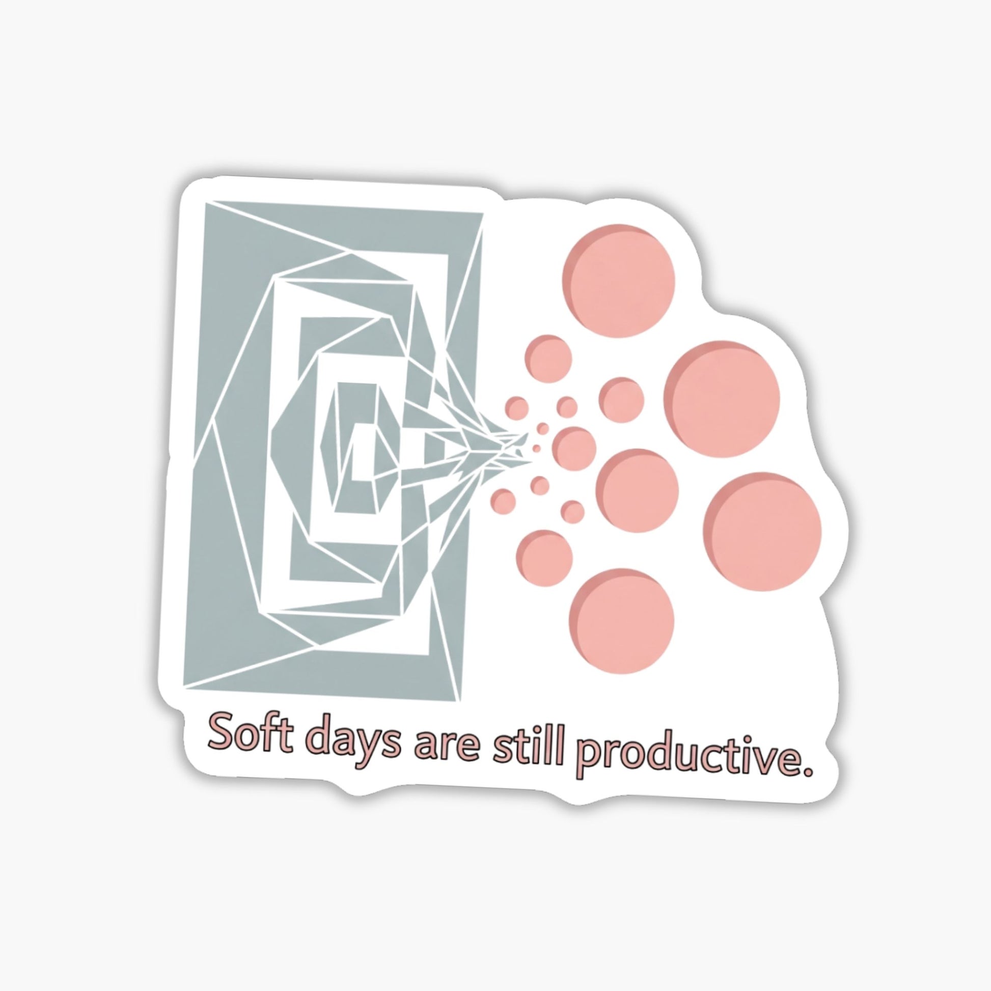 The "Soft days are still productive" sticker serves as a gentle reminder that rest is not a lack of progress. Featuring a unique geometric design where rigid squares transition into soft, flowing circles, this mental health sticker captures the ebb and flow of daily energy. Whether you are navigating burnout or practicing radical self-acceptance, this wellness decal validates that your worth is not tied to your output. Its balanced palette of light gray and soft pink creates a calming visual anchor for your space.