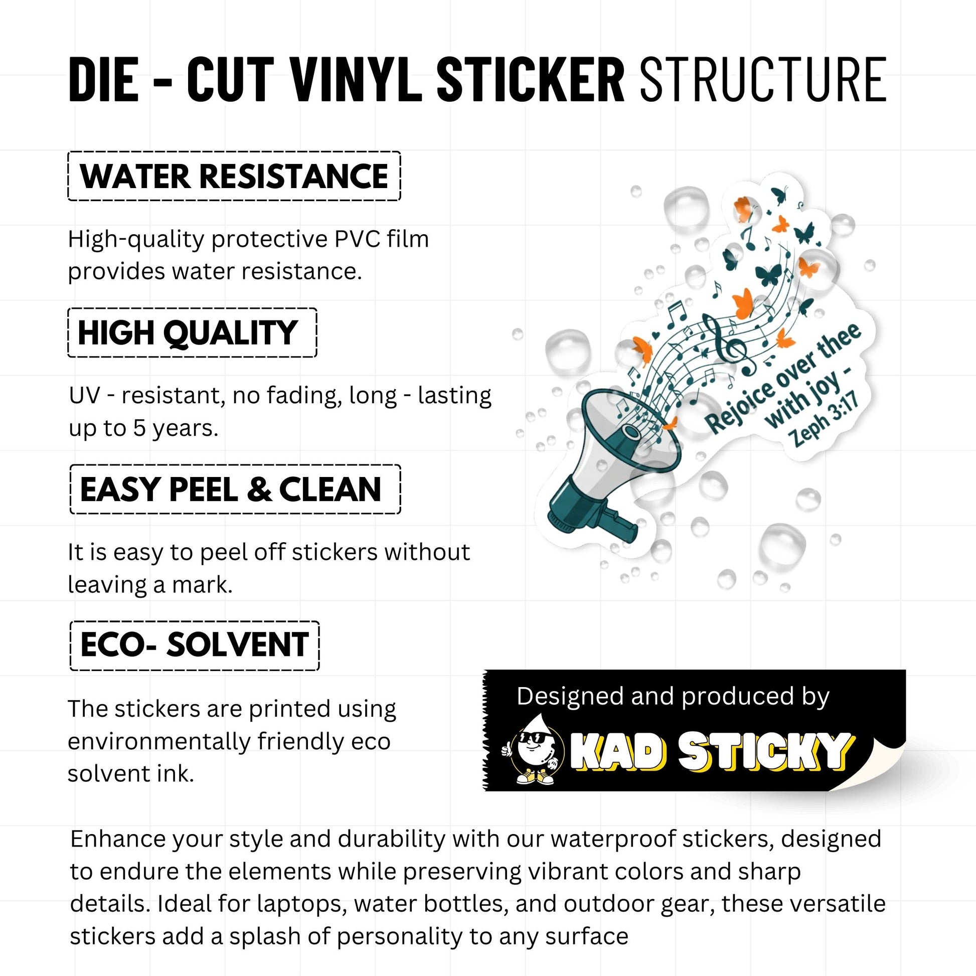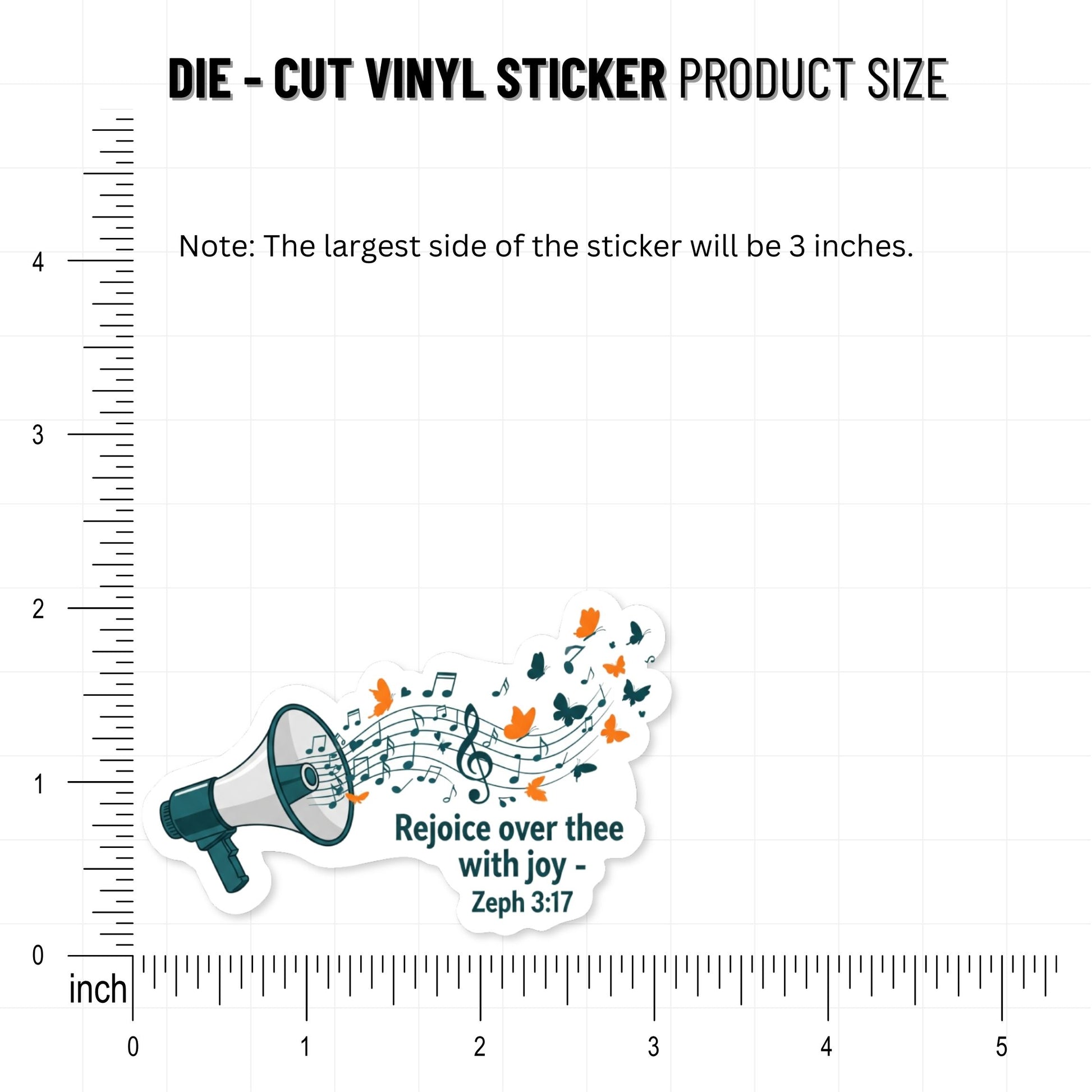 Celebrate the profound truth of "Rejoice over thee with joy - Zeph 3:17" with this vibrant Christian faith sticker, a reminder that God celebrates you with a song of love.